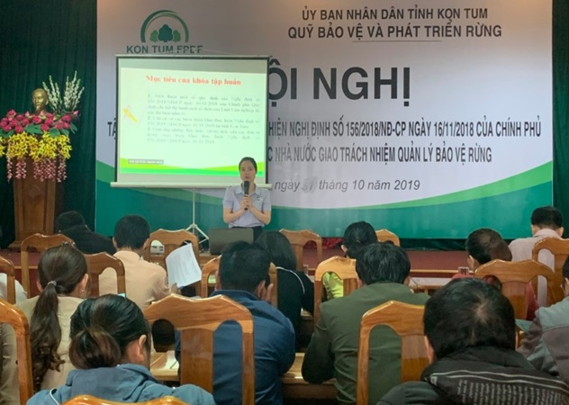 Thực hiện Nghị định số 156/2018/NĐ-CP ngày 16/11/2018 của Chính phủ Quy định chi tiết thi hành một số điều của Luật Lâm nghiệp và Thực hiện Kế hoạch truyền thông năm 2019 của Quỹ Bảo vệ và Phát triển rừng tỉnh, nhằm nâng cao năng lực cho các UBND xã, thị trấn được nhà nước giao trách nhiệm QLBVR trong việc triển khai thực hiện chính sách chi trả dịch vụ môi trường rừng theo quy định hiện hành. Ngày 31/10/2019 tại Hội trường Quỹ Bảo vệ và Phát triển rừng tỉnh; Quỹ Bảo vệ và Phát triển rừng tỉnh tổ chức Hội nghị tập huấn, hướng dẫn triển khai thực hiện Nghị định số 156/2018/NĐ-CP ngày 16/11/2018 của Chính phủ cho các UBND xã, thị trấn thuộc các huyện: Đăk Tô, Tu Mơ Rông, Ia H’Drai và thành phố Kon Tum được nhà nước giao trách nhiệm QLBVR. Đồng chí Hồ Thanh Hoàng-Giám đốc Quỹ Bảo vệ và Phát triển rừng tỉnh chủ trì Hội nghị; tham dự Hội nghị có các đại diện lãnh đạo UBND xã, thị trấn, cán bộ kế toán, cán bộ chuyên môn của các UBND xã, thị trấn thuộc các huyện: Đăk Tô, Tu Mơ Rông và thành phố Kon Tum được nhà nước giao trách nhiệm QLBVR và cán bộ Phòng Tài chính-Kế hoạch của huyện Tu Mơ Rông và thành phố Kon Tum.