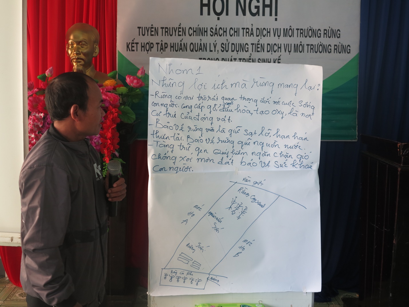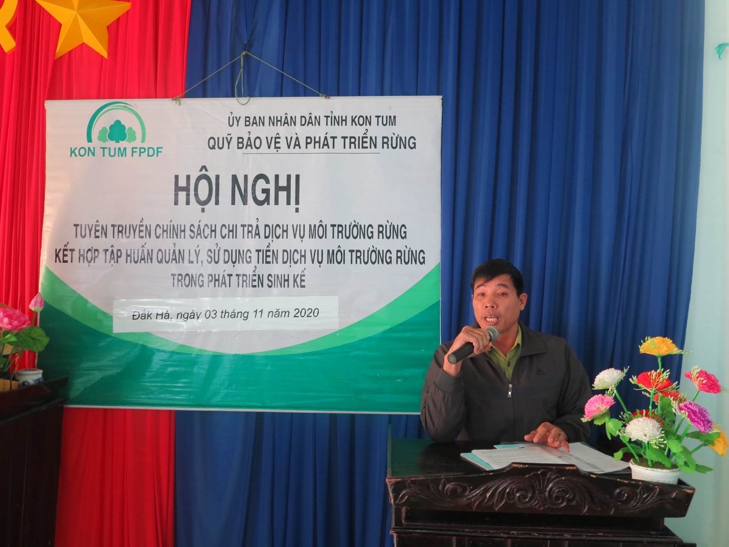Tại Hội nghị, đại diện Quỹ Bảo vệ và Phát triển rừng tỉnh đã tuyên truyền, phổ biến chính sách chi trả dịch vụ môi trường rừng gắn với công tác quản lý, bảo vệ và phát triển rừng theo Luật Lâm nghiệp năm 2017 và Nghị định số 156/2018/NĐ-CP ngày 16/11/2018 của Chính phủ Quy định chi tiết thi hành một số điều của Luật Lâm nghiệp; tập huấn quản lý sử dụng tiền dịch vụ môi trường rừng hiệu quả tại cộng đồng dân cư thôn trong công tác quản lý bảo vệ rừng (xây dựng quy chế và lập kế hoạch sử dụng tiền DVMTR tại cộng đồng dân cư thôn cho 03 hoạt động: bảo vệ và phát triển rừng, cho hoạt động chung của cộng đồng dân cư thôn; cho vay vốn phát triển sinh kế); nâng cao năng lực cho hộ gia đình, cá nhân, cộng đồng về thực hiện phát triển sinh kế (giới thiệu một số mô hình phát triển sinh kế; hướng dẫn người dân sử dụng tiền DVMTR kết hợp với các nguồn vốn khác của gia đình để phát triển sinh kế hộ gia đình); phân tích hiệu quả mô hình sản xuất (sử dụng mô hình phân tích Swot); nâng cao năng lực cho người dân trong công tác quản lý bảo vệ rừng với một số phương pháp sử dụng các công cụ đánh giá có sự tham gia (sử dụng công cụ: Lịch sự kiện; Sơ đồ nguồn tài nguyên; Giám sát và đánh giá công tác quản lý bảo vệ rừng tại hộ gia đình, cá nhân, cộng đồng dân cư thôn. phối hợp với Chi cục Kiểm lâm (Hạt Kiểm lâm huyện Tu Mơ Rông thực hiện) tuyên truyền công tác quản lý và bảo vệ rừng.