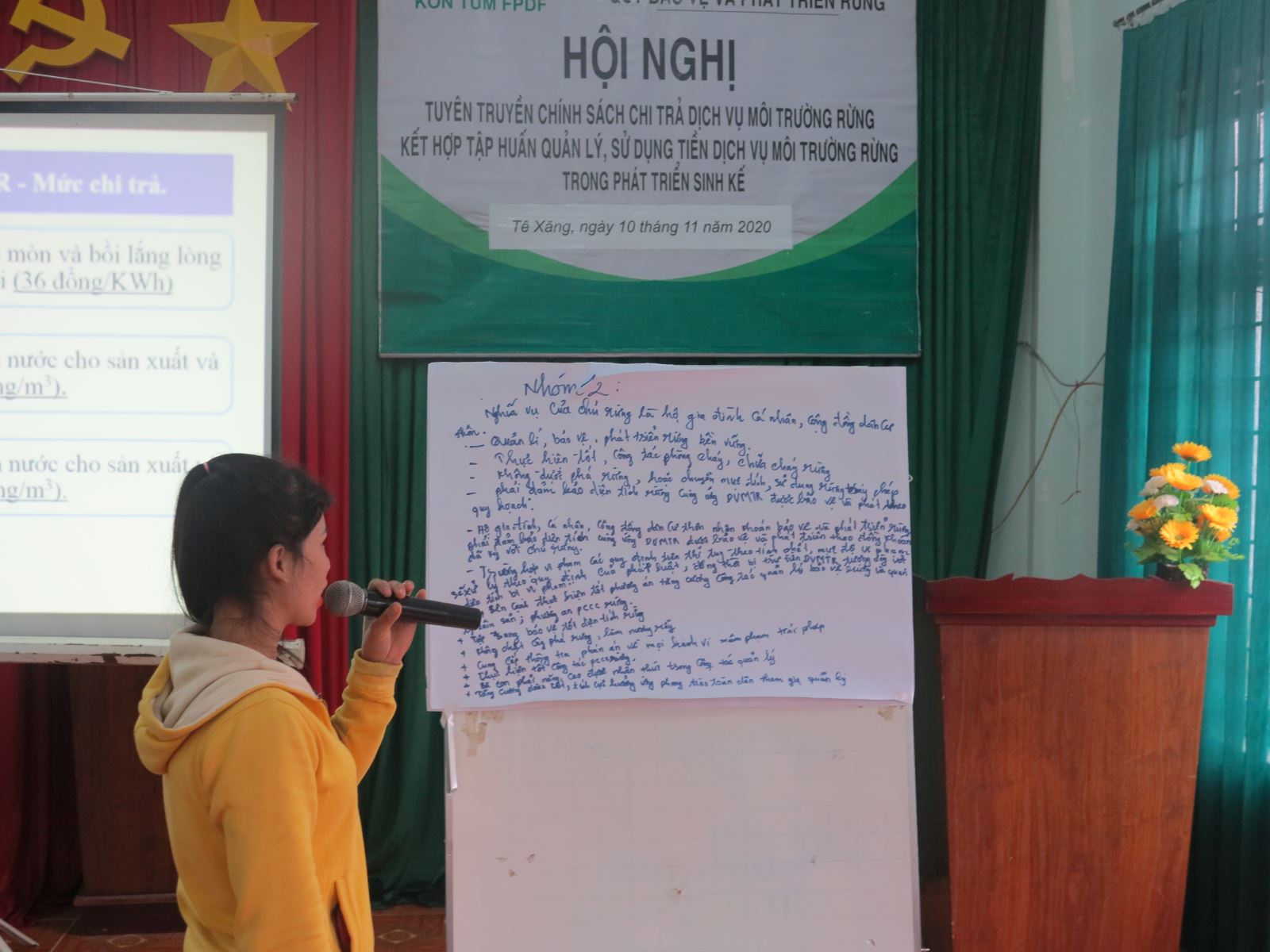 Tại Hội nghị, đại diện Quỹ Bảo vệ và Phát triển rừng tỉnh đã tuyên truyền, phổ biến chính sách chi trả dịch vụ môi trường rừng gắn với công tác quản lý, bảo vệ và phát triển rừng theo Luật Lâm nghiệp năm 2017 và Nghị định số 156/2018/NĐ-CP ngày 16/11/2018 của Chính phủ Quy định chi tiết thi hành một số điều của Luật Lâm nghiệp; tập huấn quản lý sử dụng tiền dịch vụ môi trường rừng hiệu quả tại cộng đồng dân cư thôn trong công tác quản lý bảo vệ rừng (xây dựng quy chế và lập kế hoạch sử dụng tiền DVMTR tại cộng đồng dân cư thôn cho 03 hoạt động: bảo vệ và phát triển rừng, cho hoạt động chung của cộng đồng dân cư thôn; cho vay vốn phát triển sinh kế); nâng cao năng lực cho hộ gia đình, cá nhân, cộng đồng về thực hiện phát triển sinh kế (giới thiệu một số mô hình phát triển sinh kế; hướng dẫn người dân sử dụng tiền DVMTR kết hợp với các nguồn vốn khác của gia đình để phát triển sinh kế hộ gia đình); phân tích hiệu quả mô hình sản xuất (sử dụng mô hình phân tích Swot); nâng cao năng lực cho người dân trong công tác quản lý bảo vệ rừng với một số phương pháp sử dụng các công cụ đánh giá có sự tham gia (sử dụng công cụ: Lịch sự kiện; Sơ đồ nguồn tài nguyên; Giám sát và đánh giá công tác quản lý bảo vệ rừng tại hộ gia đình, cá nhân, cộng đồng dân cư thôn.