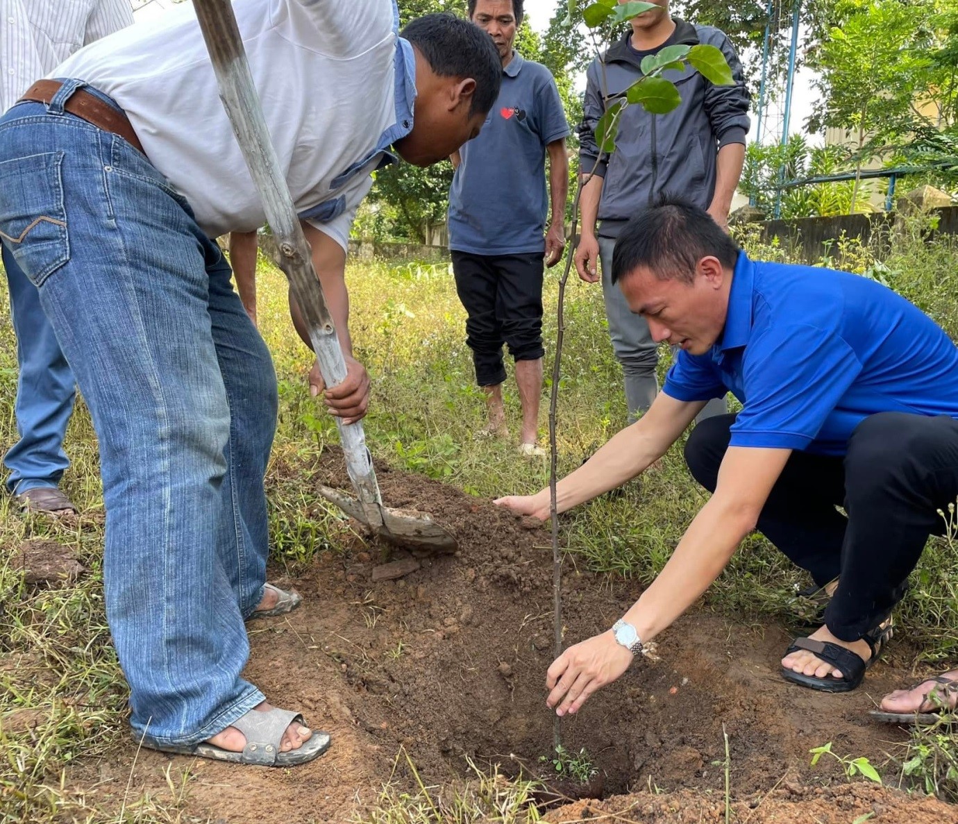Đại diện Quỹ Bảo vệ và Phát triển rừng tỉnh cùng người dân trồng cây Sao đen tại Khuôn viên Bia tưởng niệm Liệt sỹ xã Rờ Kơi, huyện Sa Thầy.