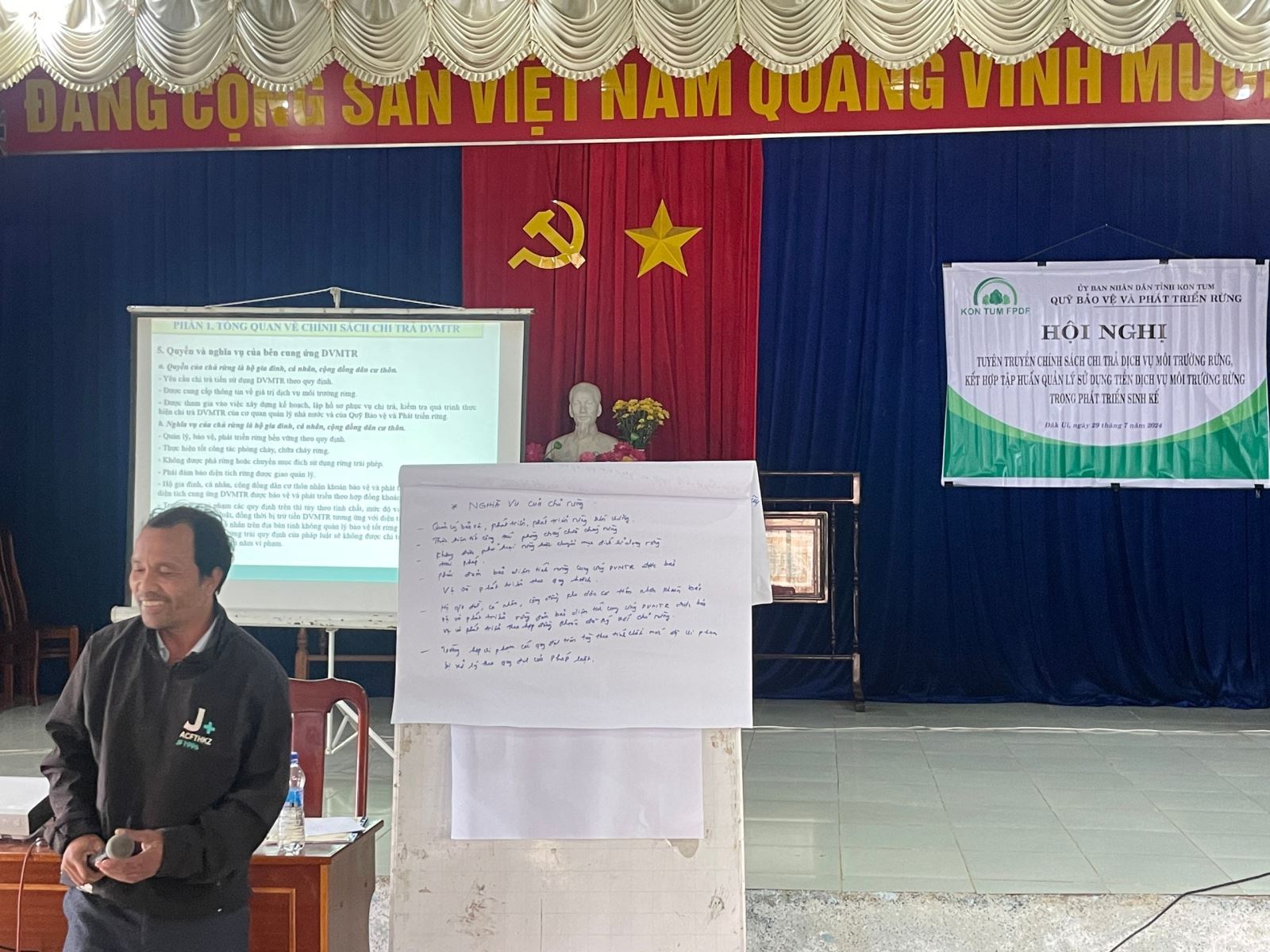 Thực hiện Kế hoạch truyền thông năm 2024 của Quỹ Bảo vệ và Phát triển rừng tỉnh, nhằm nâng cao nhận thức của cán bộ và nhân dân địa phương về trách nhiệm, nghĩa vụ và quyền lợi trong việc quản lý, bảo vệ rừng và thực hiện chính sách chi trả dịch vụ môi trường rừng có hiệu quả, thúc đẩy các hoạt động phát triển sinh kế của các hộ gia đình, cá nhân, cộng đồng dân cư thôn và người dân trên địa bàn xã Đăk Ui; ngày 29 tháng 7 năm 2024, tại Hội trường UBND xã Đăk Ui, huyện Đăk Hà, Quỹ Bảo vệ và Phát triển rừng tỉnh đã tổ chức Hội nghị tuyên truyền chính sách chi trả dịch vụ môi trường rừng kết hợp tập huấn quản lý, sử dụng tiền dịch vụ môi trường rừng trong phát triển sinh kế. Tham dự Hội nghị có đại diện: Hạt Kiểm lâm huyện Đăk Hà; các tổ chức, đoàn thể của xã Đăk Ui; Thôn trưởng và các hộ gia đình, cá nhân, cộng đồng dân cư thôn, các tổ tuần tra nòng cốt trực tiếp tham gia quản lý bảo vệ rừng và người dân trên địa bàn xã Đăk Ui (56 người).